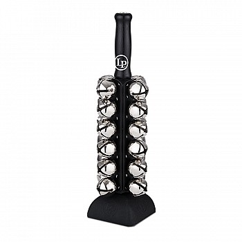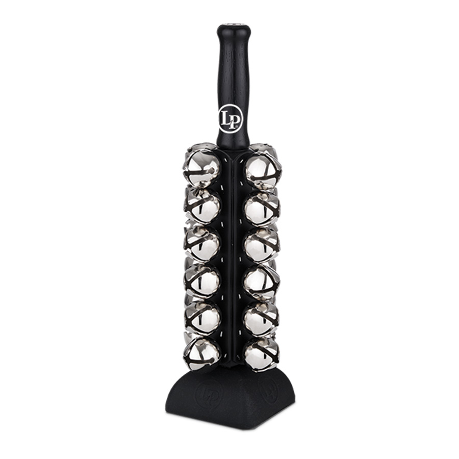 Deluxe sleigh bells, 25 steel bells mounted on large black wooden handle with silicone base. Produces a traditional jingle sound.