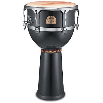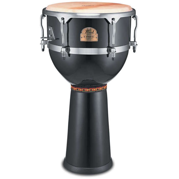Pearl fiberglass shell with goat skin head and carrying strap. Bistre Black finish.